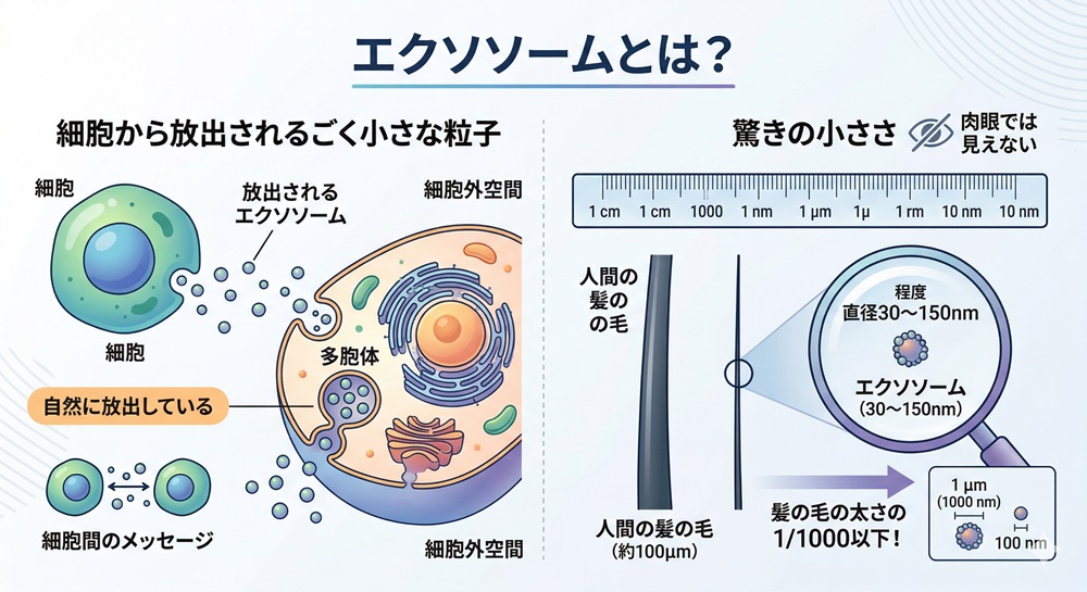 エクソソームとは、私たちの体の細胞が自然に放出している、直径30〜150nm程度のごく小さな粒子のことです。ナノメートルという単位はイメージしにくいかもしれませんが、髪の毛の太さの約1000分の1以下という、目には見えないほど極小のサイズです。