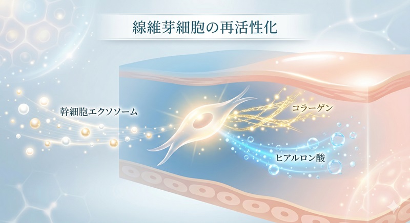 もちろん、エクソソームの作用については現時点でまだ研究段階にある部分も多く、すべての効果が科学的に確立されているわけではありません。ただ、幹細胞由来エクソソームが線維芽細胞のコラーゲン産生やヒアルロン酸合成を促進する可能性を示した研究が報告されていることは、「仕組みとして筋が通っている」という根拠のひとつになります。